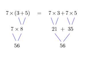 Veamos un momento qué ocurre con la propiedad distributiva: la propiedad dice que y es la que hemos utilizado en el cálculo de 12 x 7 presentado en el primer párrafo. Por supuesto, no hace ninguna falta haber oído mencionar la propiedad distributiva para entender el cálculo anterior y, de hecho, la situación es la contraria: practicar y entender cálculos como el del primer párrafo es lo que nos ayuda a entender la propiedad distributiva. En lugar de pr