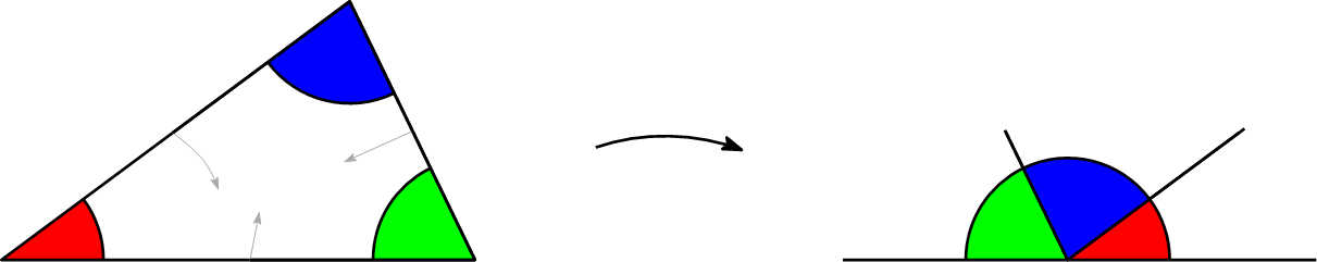 Opción 1: en la figura vemos la idea, creo que suficientemente conocida. Se colorean los ángulos de un triángulo hecho en cartulina, luego el triángulo se recorta por las flechas, y se comprueba que los tres ángulos completan un ángulo llano.