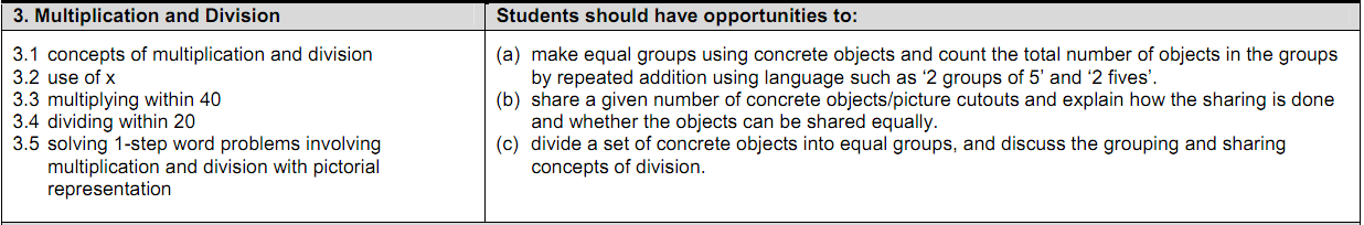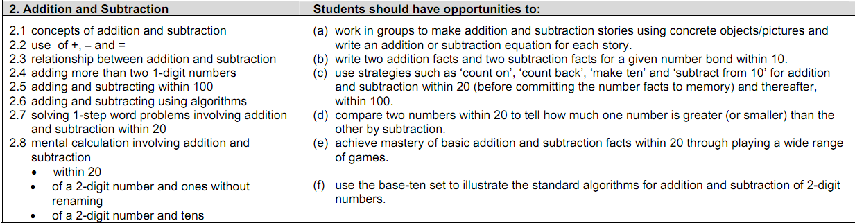 Pasando ya a un análisis de fondo, quizá lo más relevante del nuevo currículo de Singapur es la inclusión de las «experiencias de aprendizaje» como uno de los ejes vertebradores del currículo. Aunque ya se hablaba de ellas en la versión anterior, se hacía en la parte introductoria, un poco de pasada. Ahora están al mismo nivel que los contenidos. Me parece una idea muy interesante, porque es una forma muy potente de transmitir a los maestros qué tipo de actividades se recomiendan para tratar los diferentes contenidos. Como ejemplo, en la figura se pueden ver los contenidos y las experiencias de aprendizaje correspondientes a la suma y la resta en primer curso. Aquí está de nuevo el enlace al documento completo, que me parece absolutamente recomendable para cualquiera interesado en la enseñanza de las matemáticas elementales.
